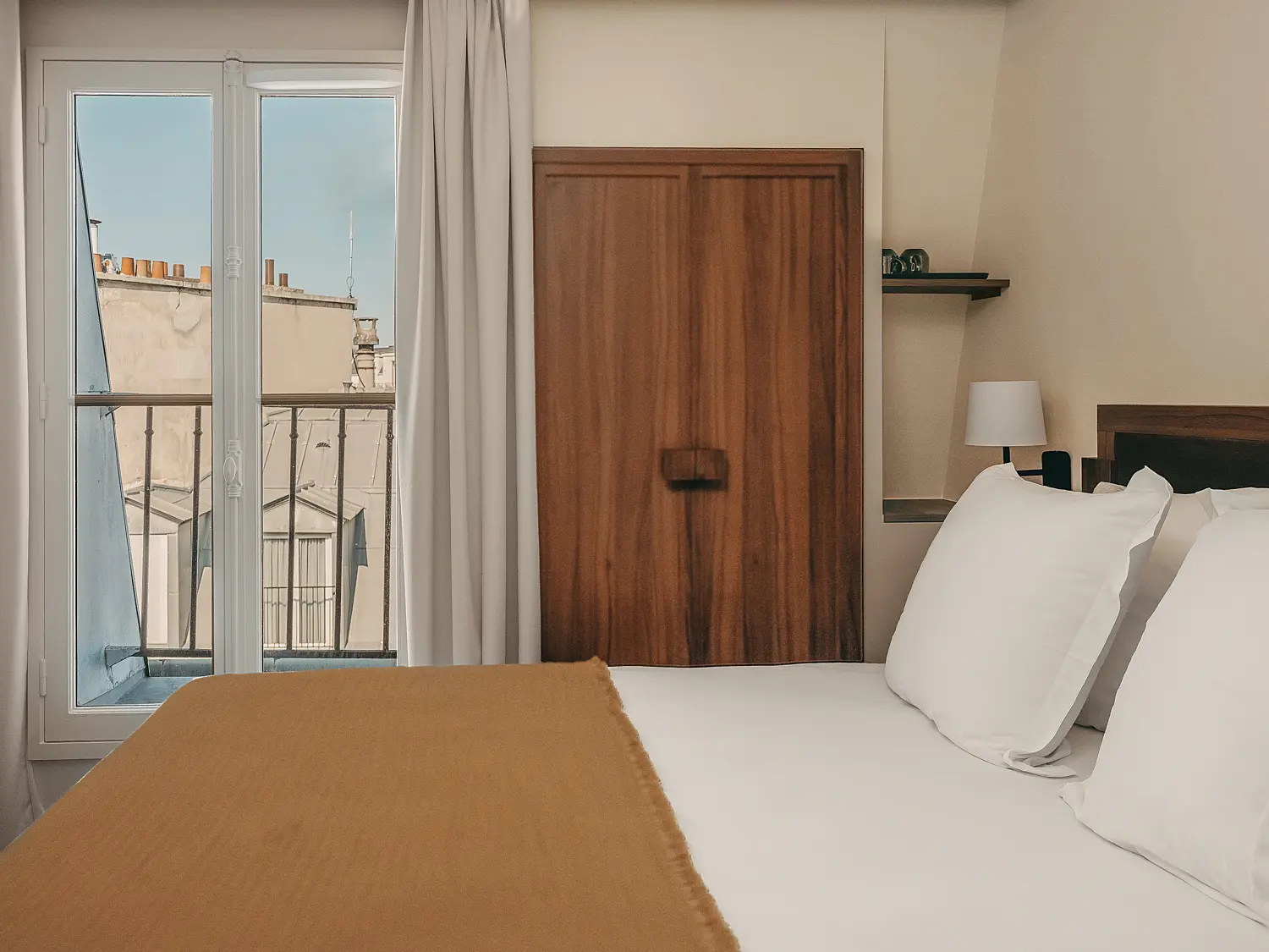 La chambre double classique avec balcon est un pur cocon de bien être et offre une belle luminosité en étage supérieur. Un coup d'oeil par le balcon vous permet d'observer les toits parisiens vers Notre Dame de Paris. Tout est prévu pour votre confort : lit double ou deux lits individuels sur demande, salle de bain avec douche pluie, produits cosmétiques Vegan "Terre de Mars" de grande qualité, bureau et wifi complètent les équipements.